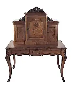 His reputation as a cabinetmaker of international distinction was cemented when, in 1862, Sueffert received a lot of publicity for his work when he made a writing cabinet using New Zealand woods, 'consisting of 30,000 pieces, valued at 300 guineas, which was purchased and presented by the citizens of Auckland to her Majesty the Queen Victoria. The cabinet is still in the Royal Collection at Buckingham Palace. He also produced a series of up to nine writing cabinets also known as Louis XV escritoire or bonheur du jour cabinets. Each of the cabinets are known by the name of the recipient and include the 'Watt cabinet' constructed for Archibald Anderson Watt, the 'Hooker cabinet' constructed for Sir Joseph Hooker, and the 'Grey cabinet' constructed for Governor George Grey. In addition to cabinets he also made tables, boxes of various sizes and covers for books of pressed ferns, as well as panels for the Governor Grey's library at Mansion House, Grey's residence on Kawau Island. All Seuffert's work was intricately inlaid and most included designs with New Zealand imagery including very accurately depicted native flora and fauna.