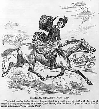 As Union forces occupied the Fairfax region in mid-1861, Ford circulated among the officers and garnered valuable intelligence about troop strengths and planned movements, which she passed along to Brigadier General J.E.B. Stuart, in whose artillery her brother, Charles, served.[2] Ford also spied for John S. Mosby, a noted partisan ranger. Stuart, grateful for her service and appreciative of the information he had received, designated Ford as an honorary aide-de-camp on October 7, 1861.