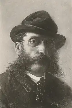 This style of painting was certainly not originated by Gandolfo, as romantic and realist painters like Corot and Courbet, also had an eye for painting humble workers and peasants. Gandolfo was also influenced by the novels of Victor Hugo and Eugène Sue.[7] It is very possible that the new Verist literature, using local themes, events of common life and stories of the everyday misery of the most humble classes, had offered to the painter new unexplored themes. Thus, while Gandolfo (between 1880 and 1885) was painting The expelled woman (L’Espulsa), The last coin (L’Ultima moneta), The woman usurer (L’Usuraia), Forced Music (Musica Forzata), Proletarians (I proletari), On the way (Per Via) and The blind woman (La cieca),[8] the literary world produced Rapisardi's Job (Giobbe), Verga's The House by the Medlar Tree (I Malavoglia) and Capuana's Giacinta. His friendship with Rapisardi was rich in meetings and conversations, that took place in the house of the latter, at Etnea street, where literature and artistic projects were discussed, as well as many other topics.
