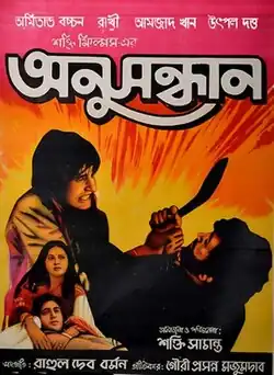 Anusandhan (in Bengali; /ə.nʊ.sən.d̪ʱaːn/ transl. Discovery) or Barsaat Ki Ek Raat (in Hindi; /bər.saːt kiː ek raːt/ transl. A Rainy Night) is a 1981 Indian bilingual action thriller film made in both Bengali and Hindi languages, produced and directed by Shakti Samanta under his banner of Shakti Films. Based on a novel of the same name by Shaktipada Rajguru, it stars Amitabh Bachchan in his debut in Bengali cinema, alongside Rakhee Gulzar, Amjad Khan, Utpal Dutt and Abhi Bhattacharya in lead roles.[1][2][3] The film follows Inspector Abhijeet Rai in search of Kaliram, a criminal whom he arrested five years ago, when his pregnant wife gets injured by the latter during her pregnancy.