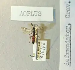 - ^ a b Yu, Dicky Sick Ki. "Aoplus defraudator (Wesmael 1845)". Home of Ichneumonoidea. Taxapad. Archived from the original on March 4, 2016. Retrieved December 20, 2015.
