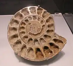 Ammonites (Apoderoceras) were predatory mollusks that resembled a squid with a shell. These cephalopods had eyes, tentacles, and spiral shells. They are more closely related to a living octopus, though the shells resemble that of a nautilus. True ammonites appeared in the fossil record about 240 million years ago. The last lineages disappeared 65 million years ago at the end of the Cretaceous.[3]