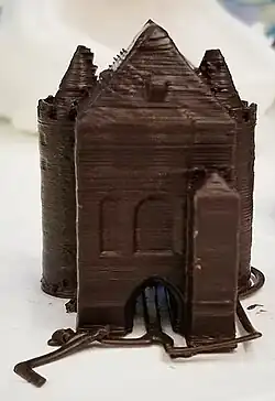 3D printing is used to manufacture moulds for making jewelry, and even the jewelry itself.[109] 3D printing is becoming popular in the customisable gifts industry, with products such as personalized models of art and dolls,[110] in many shapes: in metal or plastic, or as consumable art, such as 3D printed chocolate.[38]