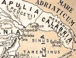 The subject of the painted pottery has been put on a scientific basis by the intensive studies of Maximilian Mayer, who has identified and distinguished the products of the several provincial schools, and has established a scheme of dating which, with some slight rectifications and adjustments, due principally to Italian archaeologist Michele Gervasio, may be considered as final.[1] The division of schools corresponds very closely to the old pre-Roman distribution of the region into three sections. Of these the most northern is Daunia, extending from the promontory of Gargano to the most southern point in the course of the river Aufidus; next to which is Peucetia, which for purposes of this classification may be said to begin at Bari and end at Egnatia. South of a line drawn from Egnatia to Taranto, the whole heel of Italy, with Lecce at its centre, is Messapia.