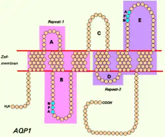 23. ^ a b Mitsuoka K, Murata K, Walz T, Hirai T, Agre P, Heymann JB, Engel A, Fujiyoshi Y (1999). "The structure of aquaporin-1 at 4.5-A resolution reveals short alpha-helices in the center of the monomer". J. Struct. Biol. 128 (1): 34–43. doi:10.1006/jsbi.1999.4177. PMID 10600556. S2CID 1076256.