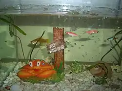 Ornamental aquarium furniture is used both for aesthetic reasons and to enrich the habitat and provide shelter for fish. Common types of aquarium furniture include artificial plants, caves, and themed decorations. Common tropes include treasure chests, shipwrecks, and vibrantly colored synthetic coral.[2][3] Using ceramic objects as aquarium furniture is controversial to aquarists, as some types of ceramic glaze can leach heavy metals into aquarium water.[4]