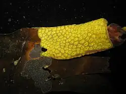 Golden star tunicates are observed in much of the world though they are invasive to eastern Canada and the Gulf of Saint Lawrence.[28] They can be identified by their flower or star shaped zooids, their clear coat, and their gelatinous texture.[28] They negatively affect shellfish, bottom-dwelling fish, and aquaculture farmers.[28] This is because they directly compete for the same resources, whether they be food or space.[29] Golden star tunicate can reproduce by free swimming larvae, or by the creation of a fragment which can grow into a full colony.[28] Boats, docks, and other sea structures allow the golden star tunicate to spread more effectively.[30]