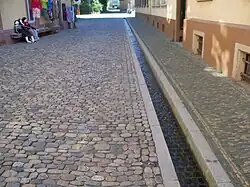 The simplest aqueducts are small ditches cut into the earth. Much larger channels may be used in modern aqueducts, for instance the Central Arizona Project uses 7.3 m (24 ft) wide channels.[11] A major factor in the design of all open channels is its gradient. A higher gradient allows a smaller channel to carry the same amount of water as a larger channel with a lower gradient, but increases the potential of the water to damage the aqueduct's structure. A typical Roman aqueduct had a gradient of about 1:4800.[12]