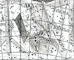 In ancient Greek mythology, Ara was identified as the altar where the gods first made offerings and formed an alliance before defeating the Titans.[1] One of the southernmost constellations depicted by Ptolemy,[3] it had been recorded by Aratus in 270 BC as lying close to the horizon, and the Almagest portrays stars as far south as Gamma Arae. Professor Bradley Schaefer proposes such Ancients must have been able to see as far south as Zeta Arae, for a pattern that looked like an altar.[4]