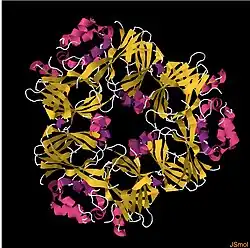 Ara h 1 is a vicilin, located in the protein fraction of the peanut cotyledon.[5][6] Ara h 1 forms homotrimers, and due to its highly stable structure, mediated through hydrophobic interactions, it has been established as an allergen.[7]