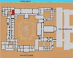 The Arabian Hall, sometimes known as the Blackamoor Hall or the Arabian Dining Room, is one of the private rooms of the Winter Palace in Saint Petersburg. In the Tsarist era, it was the room from which imperial processions through the state rooms began. The double doors[1] were designed to be on a straight axis through the principal state rooms and ultimately the Jordan Staircase, forming an enfilade. Thus it was here the Romanov family often assembled, in private, before state receptions and occasions.[2] The privacy of the room was not compromised by the small private courtyard (see plan) from which windows, which once led to the Tsaritsa's winter-garden below, admitted light.