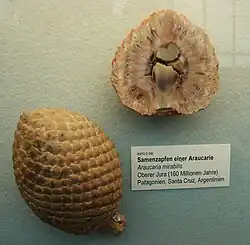 The mature seeds of A. mirabilis are about 0.8 to 1.3 cm (0.31 to 0.51 in) long and 0.2 to 0.6 cm (0.079 to 0.236 in) wide.[12] The seed integument has three layers of tissues – the sarcotesta, the thickened sclerotesta, and endotesta. It is fused to the nucellus (central portion of the ovule) only at the base.[2][6] The sclerotesta (the "shell") also exhibits a zigzag pattern of sclereids.[13] The fossilized seeds are exquisitely preserved, showing both mature and immature stages.[7] They often contain well-developed dicotyledonous embryos, indicating that they were capable of lying dormant.[14] The size of the cones did not indicate maturity as small cones around 5 cm (2.0 in) in diameter can be found with fully formed embryos. Most of the cones have been preserved before their seeds could be dispersed. Some cones, however, do not contain embryos and the naked axes of cones have also been recovered (described by Wieland as a separate species – Proaraucaria patagonica). It is believed that A. mirabilis shed only its seeds but not the scales at maturity.[13] Nevertheless, no separate petrified seeds or bracts have been recovered.[2]