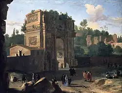 - ^ The Arcus novus, was erected by Diocletian ca. 314 on the Via lata, one of three triumphal arches on that road, and was destroyed ca. 1491 during reconstruction of Santa Maria in Via Lata. The remains, including the plinths are now in the Boboli Gardens, in Florence.[28]