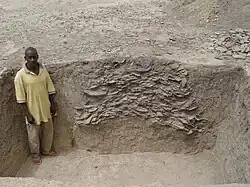 Zilum covers a settlement area of approximately 12 hectares and emerged from the Final Stone Age food-producing communities of the Gajiganna culture. The majority of the inhabitants of Zilum would have been occupied by the cultivation of crops and perhaps animal husbandry, while select groups of artisans would have contributed to the production of goods such as pottery, leather goods, and possibly beads and/or bone points.[1] Zilum belongs to Gajiganna Phase III sites, which are thought to be younger and exhibit more sedentary communities. While ceramic analysis makes correlations between Zilum's pottery assemblages and those of the Final Stone Age Gajiganna, radiocarbon measurements on organic samples from the site date Zilum to between the 7th and 5th centuries BCE, notably a transitional period between the Late Stone Age and Early Iron Age in West Africa. Despite this transitional occupation period, Zilum does not show direct evidence for iron or iron working.[2]