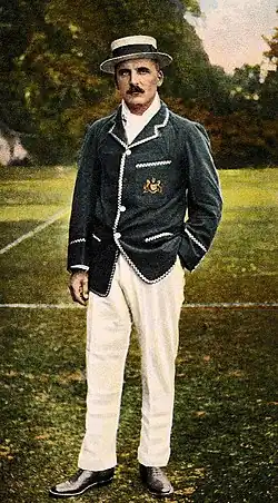 MacLaren took a new job with a wine merchant which allowed him to complete a full season in 1903. Wet weather caused many difficult pitches for batting, and MacLaren was often the only Lancashire batsman able to cope with the conditions.[105] His highest-profile success came when he captained the Gentlemen against the Players at Lord's. When his team faced defeat on the final day on a difficult pitch, he scored 168 not out and shared a partnership of 309 with C. B. Fry in less than three hours. This innings was later praised as one of his finest.[106] He ended the season with 1,886 runs at 42.86,[8] and Lancashire finished fourth.[107] However, his success with the bat was overshadowed by controversy over the England captaincy. MacLaren originally planned to tour Australia with another private team in the winter of 1903–04, but withdrew over his concerns that there was not enough strong bowling available. Frustrated with MacLaren, the cricket authorities in Melbourne asked the MCC, via Pelham Warner, to organise their own team. MacLaren was not offered the captaincy—Warner was chosen in June 1903 when Jackson proved unavailable. Newspaper rumours suggested that Lord Hawke played a part in this decision, and that MacLaren's recent paid role for Lancashire counted against him.[108] The press favoured MacLaren, and Warner was widely criticised; one journal noted that he was "condemned as an interloper and a nonentity".[109] The cricket establishment was less sympathetic to MacLaren. After publicly vacillating over the summer, he eventually decided not to tour under Warner, whom he perceived to be his junior.[109] The tour proved a great success for Warner, and his team won the Test series.[110]