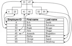 Btrieve uses indexes on certain columns to retrieve data in a speedy fashion. The structure at the top is a b-tree data structure and indexes the Employee ID column of the database table. The arrows point from the index value to the rows that contains the value in the "Employee ID" column.