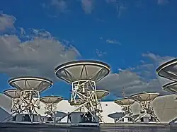 The 8 antennas of the Arcminute Microkelvin Imager Large Array viewed from Barton Road in 2012