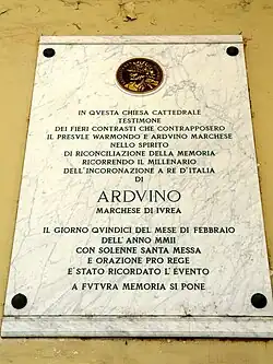 In 990, Arduin succeeded his kinsman Conrad in the March of Ivrea. Conrad was Berengar II's son and was married to a daughter of Arduin Glaber. It is unclear if Arduin was appointed to Ivrea by the king–emperor Otto III or if he succeeded as Conrad's heir.[2] The March of Ivrea, since its restructuring under Berengar II in 950, consisted of the counties of Burgaria, Ivrea, Lomello, Ossola, Pombia, Stazzona, and Vercelli, and the dioceses of Ivrea, Novara, Vercelli, and Vigevano, plus part of the dioceses of Pavia and Milan.[2] Arduin became Count of the Sacred Palace of the Lateran in Rome in 991.