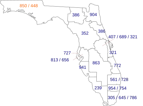 Florida area codes: 239, 305/786/645, 321, 352, 386, 407/689, 561/728, 727, 772, 813/656, , 863, 904/324, 941, 954/754