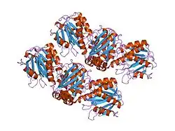 - ^ Elkins JM, Kershaw NJ, Schofield CJ (January 2005). "X-ray crystal structure of ornithine acetyltransferase from the clavulanic acid biosynthesis gene cluster". Biochem. J. 385 (Pt 2): 565–73. doi:10.1042/BJ20040814. PMC 1134730. PMID 15352873.