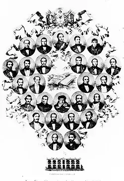 The expressed objective of the constitutional project, as that of the political projects exposed shortly before and after, was that of modernising the nation; which in an emerging state, meant little more than creating it.[11] An important part of the national thinkers considered that the project of modernisation imposed an almost total rupture with the Spanish colonial past; since Esteban Echeverría to Sarmiento and the Generación del '80, the search for the Argentine insertion in the modern world was based on the importation of theories, practices and even people. Such a rupture demanded certain kinds of conditions and dispositions; the complementation of the European markets would benefit the merchants of the port and the higher classes, capable of consuming material and symbolic luxury goods that this commerce provided, but affecting the rural and lower classes, which were displaced from the productive system in which they were situated.[12] Aware of this, the leaders most opposed to Rivadavia's program concealed the task of formation of the state as a 'restoration' of the state that Rivadavia's reforms had broken:[13] therefore, Rosas's title of "Restaurateur of Laws" that referred not to the Positive laws of the Right of Indias, but to the Natural law of the traditional nationals. The problem of this view was the impossibility, for a long time in Rosas' period, of effectively developing the national state. The restoration of the order, that in previous years had dissolved in the successive confrontations between the caudillos and the hegemony of the new Buenos Aires metropolis, resulted in a paralyzing of the process of building a state. When the sanction of the constitution broke that phase, and searching to introduce the new governmental system, the matter returned with all sharpness.