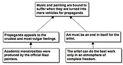 Beardsley said that the conclusion in this example is statement ②. Statement ④ needs to be rewritten as a declarative sentence, e.g. "Academic monstrosities [were] produced by the official Nazi painters." Statement ① points out that the conclusion isn't accepted by everyone, but statement ① is omitted from the diagram because it doesn't support the conclusion. Beardsley said that the logical relation between statement ③ and statement ④ is unclear, but he proposed to diagram statement ④ as supporting statement ③.
