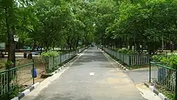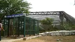 The main entrance of the park is located towards the south west along the Grand Southern Trunk Road. The entire campus is enclosed by a compound wall.[27][30] Close to the entrance, there is a children's park on one side and lawns on the other side. The enclosure of water fowl is located close to the children's park next to the primate section, followed by the terrestrial birds. A circular pathway takes the visitors to the interior of the park around the hillock. The enclosures for the carnivores are situated on the top of the hill with the herbivore exhibits along the slopes. Lower down the road are two smaller loop sections with one consisting of the bear enclosures and the other accommodating the walk-through aviary. The bear section leads to the lion safari at the north east corner of the zoo.[31]