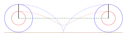 In an alternative version of the problem, the smaller circle, rather than the larger one, is in contact with the horizontal surface. Examples include a typical train wheel, which has a flange, or a barbell straddling a bench. American educator and philosopher Israel Drabkin called these Case II versions of the paradox,[1] and a similar, but unidentical, analysis applies.