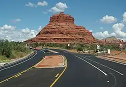 The southern terminus of SR 179 is at exit 298 off of I-17; the exit is about 15 miles (24 km) north of Camp Verde. SR 179 heads northwest from the interchange briefly before curving towards the north. It keeps this heading as it passes through the red rock area of the Village of Oak Creek on its way to Sedona, just a few miles north. As it enters the Sedona city limits, it roughly follows along the east bank of Oak Creek. It crosses the creek just before reaching its northern terminus at SR 89A.[1]
