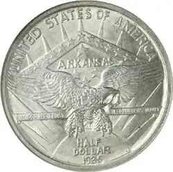 The Arkansas Centennial half dollar is a commemorative fifty-cent piece struck by the United States Bureau of the Mint from 1935 to 1939.[1][2] The coin was designed by Edward E. Burr and commemorates the 100th anniversary of Arkansas's admission to the Union in 1836.[2]