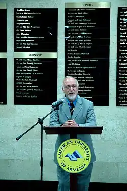 After the Spitak earthquake of 1988 in Armenia, Der Kiureghian played a leading role in establishing the American University of Armenia in Yerevan as an affiliate of the University of California. He served concurrently as the founding dean of the College of Engineering (1991–2007) and as interim provost (2011–2012) of AUA with his position at Berkeley. He has also served as the founding director of the Engineering Research Center of AUA (1991–2004), a has been a founding member of the board of trustees of AUA. He served as interim university president since President Bruce Boghosian's departure in July 2014. In January, Der Kiureghian has accepted the position of president of AUA.[1] In May 2019, he passed the baton to Dr. Karin Markides.[2]