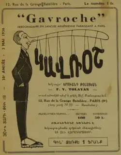 | Gavroche (by Yervant Tolayan)[11] | Կավռօշ | "Gavroche" | Satirical newspaper | 1908-1936 | Constantinople (1908-1925)