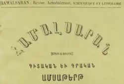 | Hamalsaran (by Missak Baghdassarian and Hovhannes Chavarch) | Համալսարան | "University" | Scientific and literary magazine, monthly/bimonthly | 1899–1902 | Paris | ![]() |