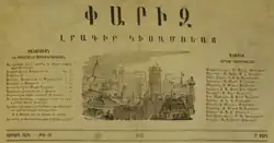 The first journal was Maciats Aghavni (Մասեաց աղաւնի, "The Dove of Mount Ararat," 1855–1858 in Paris,[1] then until 1865 in Theodosia) by Father Gabriel Aïvazian (1812-1880, brother of Ivan Aivazovsky), which aimed to promote the cultural, scientific, and moral education of the people.[1] Shortly thereafter, Pariz (Փարիզ, "Paris", 1860–1864) was published.[2][1] At the same time, Arevelk (Արեւելք, "Orient," 1855-1856) and Arevmoudk (Արեւմուտք, "Occident, " 1859 and 1864–1865) by Stepan Voskan (1825-1901), which espoused a militant and nationalist vision inspired by the Risorgimento.[2][1] Voskan sought to spread ideas of economic and social progress and ideals of freedom inspired by French political struggles.[3]