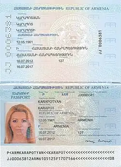 ![]() Front personal-information page of an Armenian biometric passport, since 2012. | |