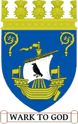 Blazon: Azure a galley Or the sail thereof Argent charged with a raven Sable and in chief two crosier heads Or. |