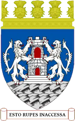 Blazon: Per fess in chief per pale Azure and Vert in base Azure in chief a pale Or charged of a lymphad sails furled and oards in action Sable flagged Gules all between dexter a castle triple-towered and embattled Argent masoned Sable windows and port Gules and sinister a boar's head erased holding in its mouth a shank-bone of a deer Argent and in base a stag's head cabossed Or overall on a fess wavy Argent a barrulet wavy Azure. |
