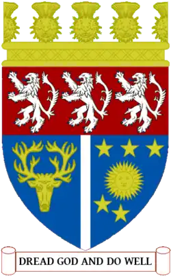 Blazon: Argent on a mount in base a stag lodged reguardant in front of an oak tree all Proper the tree charged of an inescutcheon of the arms of the Earl of Lauderdale (Or a lion rampant Gules couped at all his joints of the field within the Royal Tressure Azure). |
