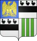 Party: 1st, Azure, to a right hand, cuirassed Argent, holding a sword of the same, garnished Or; 2nd, Or, a fess Vert, charged with two passers-by, each leading a woman, all Argent, the fess accompanied in chief by a flight Sable, and in base of a cross pattée reamed of the same; to the chief of the dukes of the Empire debruising. | ![]() |