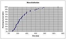 To illustrate, consider a sample of 50 stones sourced from a quarry in Bulgaria. The blue rectangle is of A4 size. Every stone's weight is individually recorded, and their masses are illustrated in the attached graph. The horizontal axis represents the individual stone mass, while the vertical axis denotes the cumulative mass as a percentage of the entire sample's mass. At the 50% mark, the M50 value is discerned to be 24kg. The true median for this sample is the mean mass of the 25th and 26th stones. In this specific instance, the M50 closely matches the median mass, which is 26kg. This sample meets the criteria for LMA5-40. However, it's important to note that the sample size is insufficient. According to EN13383, such a sample should comprise at least 200 stones.[1]