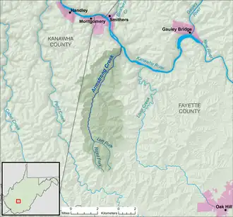 Armstrong Creek is a tributary of the Kanawha River, 8.6 miles (13.8 km) long,[5] in southern West Virginia in the United States. Via the Kanawha and Ohio rivers, it is part of the watershed of the Mississippi River, draining an area of 22.8 square miles (59 km2)[6] on the unglaciated portion of the Allegheny Plateau. The creek flows for its entire length in western Fayette County; its tributaries additionally drain a small portion of eastern Kanawha County.