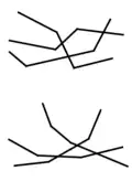 A common diagram used to represent an arrangement is the wiring diagram, a series of parallel lines with crossings between them drawn as an "X" in a simple crossing.[1] When drawn this way, they can be described with notation for either the order in which each line crosses the other, the state of the orders between each crossing (or allowed groups of crossing whose orders do not matter), or as a list of pairs, each pair being the labels of 2 lines which have crossed, ordered in a given direction (usually left to right). They draw similarities to braids, although without any need to keep track of which crosses atop the other, the crossings may be seen as elements of the Coxeter group.