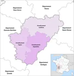 The 3 arrondissements of the Charente department are:[1]