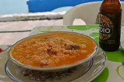 Arroz a la tumbada is a traditional Mexican dish prepared with white rice and seafood.[1] In this specialty a sofrito is made with chopped tomato, onion, garlic and red pepper. Rice and fish broth or water is added, then seafood which may include shrimp, clams, crab, calamari and whitefish.[2] The dish may be seasoned with fresh leaves of epazote, parsley, coriander and oregano. Arroz a la tumbada is traditionally cooked in a cazuela, which is a thick clay pot.[3]
