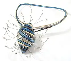 Art historian Liesbeth den Besten has identified six different terms to name art jewelry, including contemporary, studio, art, research, design, and author,[1] with the three most common being contemporary, studio, and art. Curator Kelly L'Ecuyer has defined studio jewelry as an offshoot of the studio craft movement, adding that it does not refer to particular artistic styles but rather to the circumstances in which the object is produced. According to her definition, "Studio jewelers are independent artists who handle their chosen materials directly to make one-of-a-kind or limited production jewelry..... The studio jeweler is both the designer and fabricator of each piece (although assistants or apprentices may help with technical tasks), and the work is created in a small, private studio, not a factory."[2] Art historian Monica Gaspar has explored the temporal meaning of the different names given to art jewelry over the past 40 years. She suggests that "avant-garde" jewelry positions itself as radically ahead of mainstream ideas; "modern" or "modernist" jewelry claims to reflect the spirit of the times in which it was made; "studio" jewelry emphasizes the artist studio over the craft workshop; "new" jewelry assumes an ironic stance towards the past; and "contemporary" jewelry claims the present and the "here and now" in contrast with traditional jewelry's eternal nature as an heirloom passing between generations.[3]