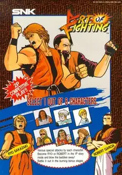 Art of Fighting (Japanese: 龍虎の拳, Hepburn: Ryūko no Ken; lit. "Dragon & Tiger Punch") is a fighting game released by SNK for arcades on 24 September 1992. It was eventually ported to the Neo Geo AES, Neo Geo CD, PC Engine Arcade CD-ROM², Sega Genesis, and SNES. The game follows Karate users Ryo Sakazaki and Robert Garcia as they travel to fight criminals from the Southtown city in order to find Ryo's missing sister Yuri. The game employs special moves and stronger Desperation Moves that can be performed strategically by filling the player's energy bar and removing enemies by taunting them.