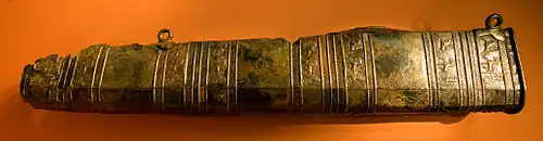 Many features of Urartian art were preserved in the neighboring countries after the fall of Urartu in the 6th century BC. Observations by Boris Piotrovsky suggest that decoration and production techniques of Scythian belts and scabbards were borrowed from Urartu.[3] The Urartian way of decorating cauldrons spread over the ancient world, and it is believed that Armenian art and that of southern Georgia were partly based on the Urartian traditions.[21][23] Urartu used cylinder seals similar to those from other ancient states of the Ancient Middle East. They depicted the moon, stars, religious images and sometimes hunting scenes.
