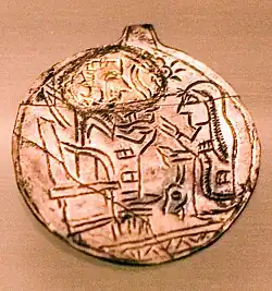 Jewelry of Urartu had two gradations: ornaments made of precious metals and stones for the king and his family, and their simplified bronze versions used by the rich. Many jewelry items were also used as amulets.[16] Annals of the Assyrian king Sargon II mention vast amounts of Urartian jewelry items made of silver and gold which were taken from Musasir in 714 BC.[1] They are not preserved and some may have been melted by treasure hunters.[3] The two largest recovered jewelry items are shown below. They are the pectoral decoration excavated at the late Urartian capital Rusahinili and the cover of the cauldron found at Teishebaini. Smaller items include golden pins, earrings, a bracelet and a few medallions. Jewelry was worn in Urartu by both men and women. Women's jewelry usually portrayed the Urartian goddess Arubani, wife of Ḫaldi – the supreme god of Urartu. Also common are Mesopotamian motifs such as tree of life and winged sun. More accessible jewelry included bronze bracelets and earrings and carnelian beads.[16]