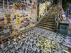 Inspired by the Lennon Wall in Prague, Czech Republic, a banner reading "Lennon Wall Hong Kong" was set on the outside wall of an Admiralty district staircase, turning the wall into one of the landmarks of the occupied district. The original Lennon Wall was set up in front of the Hong Kong Central Government Offices staircase. During June and July 2019, Lennon Walls covered with colourful post-it messages about freedom and democracy "blossomed everywhere" (遍地開花),[38] appearing throughout the city.[39][40][41] They are typically found on the walls of underpasses and pedestrian bridges,[42] on shopfronts, and inside government offices.[43][44] Protesters have also plastered protest posters, derivative works, and illustrations on Lennon Walls to spread awareness. Pictures of police brutality were highlighted to broadcast the protesters' interpretation of the events.[45] Protesters used post-it notes to create Chinese characters and diagrams.[46] For the protesters, the Lennon Walls serve as a symbol of hope and support between like-minded individuals.[3] After the passing of the Hong Kong national security law on 30 June 2020, notes on Lennon Walls were replaced by blank notes to maintain a form of protest that was not punishable by the law.[47]