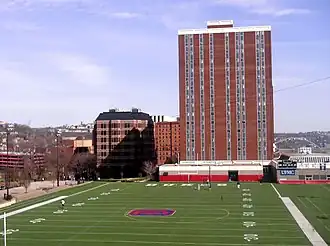 Its location atop the Bluff in the center of Duquesne's campus makes Rooney Field one of the most unusual football facilities in the nation. Bordered by Academic Walk on one side and Mellon Hall of Science and the Duquesne Towers Living and Learning Center on either end, the field offers views of downtown Pittsburgh, the Monongahela River, and Pittsburgh's South Side.